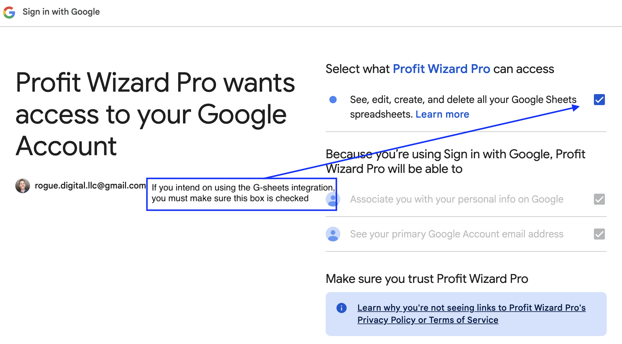 If you are having trouble using the G-sheets integration, you should log out, then re-authorize and check this box.